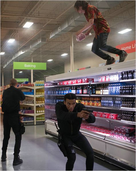 Derrière un pitch somme toute assez banal se cache un scénario hallucinogène signé Max Landis (Chronicle) qui essaie visiblement de se détacher des blockbusters hollywoodiens d’action en dépeignant une Amérique coupée du monde, où phénomènes étranges côtoient affaires d’état durant une nuit de folie. Loser enfumé, Mike est l’anti-héro par excellence, de ces zonards qui deviennent comme par miracle invincibles face à un groupe d’hommes armés jusqu’aux dents. Une façon peu subtile – et très plébiscitée par le cinéma américain –, de sous-entendre que dans chaque ado boutonneux se cache un surhomme formidable. Ici, Mike se révèle être un véritable soldat surentrainé jusqu’alors gardé « en sommeil » pour sa propre sécurité. Réactivé juste à temps par un agent de la CIA, le jeune demeuré va retrouver peu à peu ses facultés sous forme de flash. Si l’argument sert quelques scènes plutôt cocasses, il vient directement contredire un des fils rouges du film, à savoir l’accès à l’engagement et à la maturité du héro. En effet, Mike n’a rien demandé à personne, tous ses nouveaux talents lui sont donnés sur un plateau, ne lui demandant aucun effort pour grandir. Ainsi, comme tout est inné, tout l’intérêt pour son évolution est tué dans l’œuf. L’objectif du personnage principal étant d’office mis hors course, le film s’attèle à étirer sa course-poursuite à travers la ville avec des injonctions d’ultra violence (très à la mode), des accès psychédéliques et un humour noir malade plutôt maladroit avec un Walton Goggins en ersatz de Nicholson dans Shining.