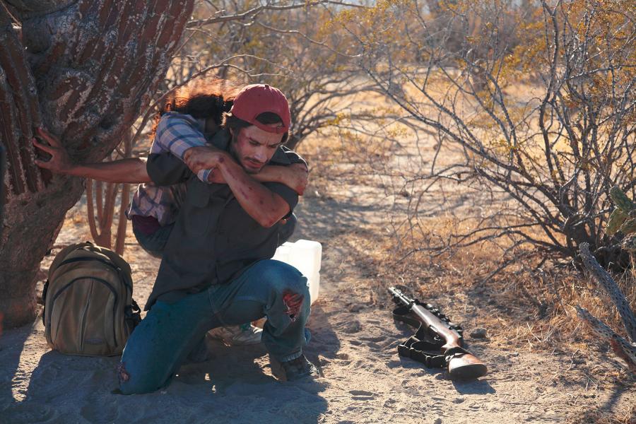 Quelque part entre le Mexique et les États-Unis sur le bord de la frontière, un groupe de clandestins s’apprête à franchir le Rubicon pour l’Eldorado. Sam, un Texan du cru, chasse dans les parages, fusil au poing, accompagné de son chien. Quelle proie traque le chasseur dans la nudité crue des sables et des roches ? Notre petite troupe échoue au milieu du désert suite à une panne de véhicule. Il ne reste plus que la marche à pied pour traverser la zone la plus dangereuse et toucher le rêve américain. Qu’importe, c’est l’argent pour les passeurs et la dernière ligne droite pour les émigrants qui motivent le risque. La troupe suit le guide dans ce méandre où errent le chasseur et les trafiquants, maitres des cartels. Les paysages étirent leur longue ligne de fuite vers l’horizon où le ciel d’azur tranche sur la couleur des roches et du sable jaune.