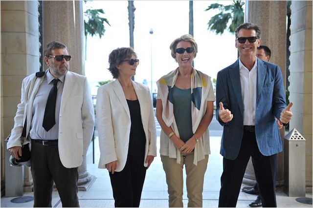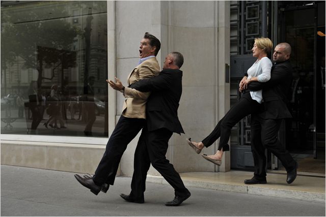 Nous pensons au talentueux Blake Edwards et particulièrement à The Party avec Peter Sellers, maitre de la comédie absurde dans les années 60, 70 dont le style, mélange sentiments et burlesque, dans la lignée des grands comiques du muet ayant pris la parole. Nous pouvons voir aussi l’influence de Tati, de la comédie italienne. Peter Sellers en inspecteur Clouseau de La Panthère Rose demeure le meilleur exemple de cette légèreté non dénuée de mélancolie et d’autodérision. Le tout est souvent accompagné des violons et des cuivres d'Henri Mancini. Lui succèdera Mel Brooks, annonçant déjà les frères Zucker et la comédie un peu plus trash des Farelly et compagnie. C’est donc dans l’esprit du maitre de la farce moderne que souhaite s’inscrire Duo d’escrocs. Hélas, très vite les répliques et situations trouvent leurs limites et aboutissent à un film sans saveur où poignent des idées sabotées. Par exemple, la fin à la James Bond se rapproche plus de la comédie franchouillarde ratée. Jouée au premier degré, elle s’avère d'aucun effet et même passablement énervante, voir farfelue. Il fallait pousser le trait, jouer la parodie jusqu’au bout. La figure de Jerry, censé être un vieux baroudeur, méritait un meilleur traitement, tout comme le couple Pierce Brosnan et Emma Thompson. Au final, le tout manque de saveur et de répondant, jamais elle ne décolle dans celle du maitre, chaque mot, chaque situation vous amène au fou rire ! Laurent Lafitte dans un petit rôle n’apporte rien et ne donne pas d’étoffe à celui-ci. Louise Bourgoin est bien la seule qui se rapproche dans le lointain des personnages des comédies des années 60,70. Le film se veut sans doute une suite au succès de son second long-métrage Last chance for love (2009) où Emma Thompson et Dustin Hoffman trouvent enfin le grand amour en pleine crise du troisième âge. Le Britannique Joel Hopkins exploite à nouveau le filon. Hélas si le rythme est présent dans son fond, Duo d’escrocs se montre dépassé et regardable, mais sans intérêt.