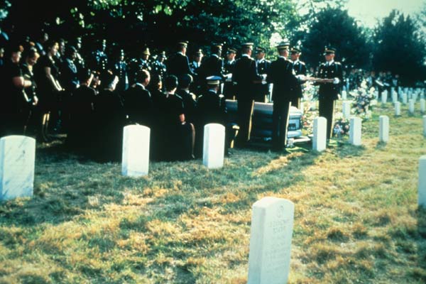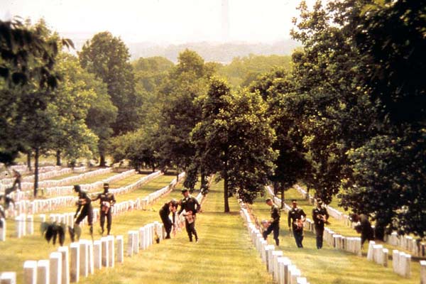 Il souhaite préparer les jeunes recrues à l’indicible chaos. Jackie Willow représente le fils du vétéran qui souhaite inscrire son histoire dans celle de son père. La relation qui s’installe entre Willow et Hazard devient celle d’un père et d’un fils. C’est celui qui ne sait pas, l’innocence brisée sur les flammes d’un enfer qu’il découvrira bien plus tard. Samantha Davis se situe entre les deux, militant pour la paix et la diplomatie, la vie contre la mort. Tous les trois finiront sur ou dans une tombe au cimetière d’Arlington. C’est la mort qui finit par triompher. Elle réunit les vivants et les hommes tombés au champ de bataille, depuis la guerre de Sécession jusqu’à aujourd’hui. C’est ici que flottent les oriflammes, que tonne le canon pour un dernier hommage. Au chaos de la mise en scène d’Apocalypse Now répond le classicisme de Jardins de Pierre. À l’instar de son sujet, tout doit être en ordre pour le dernier voyage, parfait.