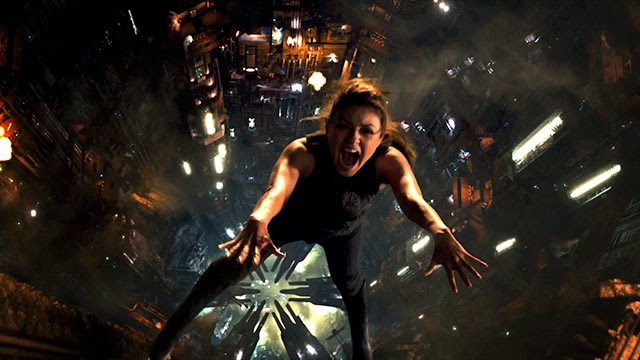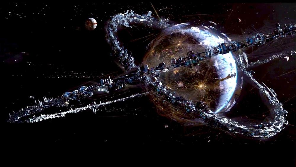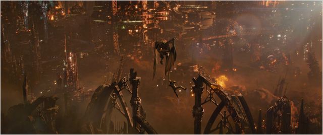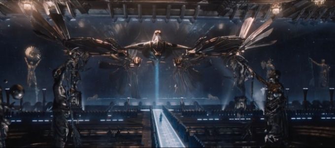 Impossible de trancher ou de faire l’avocat du diable ici. Dans Jupiter : le destin de l’univers, il y a clairement deux poids, deux mesures. D’un côté, on retrouve toute la propension des cinéastes à faire du cinéma pop corn avec romance et théâtralité, grossier et grotesque, et d’un autre, on assiste à l’éclosion d’une idée originale, bien que linéaire, qui offre au duo une amorce infinie pour leurs digressions esthétiques extravagantes mais bluffantes. Pour leur premier film réalisé en 3D, il est vrai qu’ils ont tapé fort, aidés du concepteur d’effets spéciaux John Gaeta, oscarisé pour son travail dans Matrix, du chef opérateur John Toll et du monteur Alexander Berner (Cloud Atlas). Ensemble, ils mettent au point des myriades de séquences d’action numérique toutes plus pétaradantes les unes que les autres, le tout dans un enchainement d’acrobaties et de péripéties enlevé. Mention spéciale à la course poursuite entre ciel, terre et mer dans Chicago, jonchée d’effets sensationnels et montée au millimètre pour une expérience aérospatiale décoiffante. A cet exercice, qui pourrait commencer à lasser, les Wachowski se révèlent encore plein de ressources et parmi les plus doués en la matière. Dans un dédale de décors surilluminés et fantasmagoriques, l’accumulation de motifs et la richesse des décors témoignent de l’imagination débordante des créatifs, et on en redemande (attendez de voir Tatum dans son bain face à la fenêtre de son vaisseau, observant Jupiter, fascinant…).