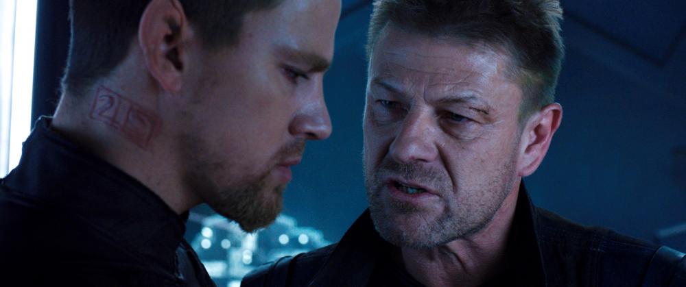 Comme bien souvent dans le genre SF, face à cette esthétique pour le moins envahissante, le scénario n’en mène pas large. Avec un script original de 600 pages (pas moins !), les Wachowski ont vraisemblablement passé plus de temps à décrire le contexte qu’à se consacrer aux dialogues. Les clichés s’enchainent, visant à annihiler toute crédibilité ou subtilité chez leurs personnages : le méchant chuchotant très théâtral, les sbires tout droit sortis d’un vieil épisode de Star Trek, la famille russe qui trafique et dont le patriarche hurle « par les couilles de Staline !». En plus de ça, la pseudo-romance façon la Belle et la Bête qui se trame entre Jupiter et Cain semble complètement catapultée de l’au-delà. On comprend ça et là où le duo de réalisateurs veut en venir dans sa vision des choses selon laquelle l’univers serait gouverné par trois héritiers dont l’un, Balem (Eddie Redmayne surprenant mais décevant), cultive les humains sur la Terre en vue d’une grosse moisson à venir qui permettra de grossir les stocks de cellules humaines régénératrices. Le postulat est plutôt bon à vrai dire (si on aime le genre) mais il est traité avec une telle naïveté pro-action et pro-romance que ça en devient assez rapidement grotesque. Pour essayer d’en faire toujours plus, les Wachowski vont aller jusqu’à introduire un léger ton comique dans leur œuvre grâce au duo Tatum/Kunis et à quelques situations cocasses : on pense notamment à la métaphore de l’administration qui est, dans leur univers, un vrai capharnaüm. Channing Tatum, blondinet bodybuildé, guerrier génétiquement mixé avec le loup est flanqué d’oreilles de “Spock“ du plus mauvais effet mais arrive à sauver sa partition dans un personnage faussement vulnérable. En face, Mila Kunis semble à des années lumières de son rôle mais n’a pas besoin d’en faire des tonnes pour incarner un personnage un peu vide, bien que central.