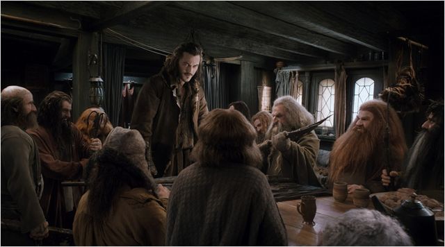 Le bien et le mal, le noir et le blanc aiguisent leurs lames, ils ne sont pas encore gris. Ils sont bien tranchés dans le cœur des hommes et du monde. Peter Jackson, autour de ce cœur battant, rajoute. Il explore d’autres contrées, d’autres récits, celui d’un dernier Mohican, Beorn. Il représente ce qui attend Thorin Ecu de chêne s’il abandonne. De même, le roi des Elfes noir est la part d’arrogance, d’égoïsme qu’il trouvera sur l’une des voies qui l’égarent. Legolas, comme son père, pense que ce n’est pas son combat. Seul Tauriel comprend que c’est bien le leur, car si les nains perdent, l’ombre envahira tout. Dernière thématique, le roi sans royaume se retrouve dans la cité avec Bard le batelier, prince déchu comme l’ancêtre de Thorin , nouveau roi Midas. Bard porte le poids de l’échec, de la faute qui condamne son peuple à vivre dans l’antre de l’enfer. Tous ces échos nous ramènent au cœur de la quête, elle ne peut être un échec, car elle conduirait à l’une ou l’autre de ces impasses.
